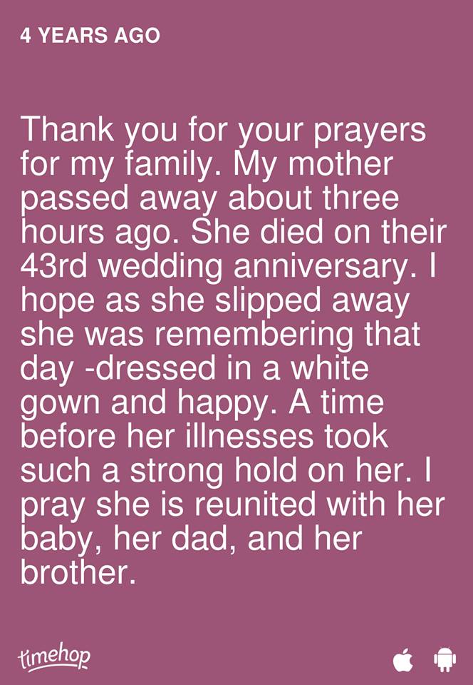 So this is a day that I have to do alone. It’s not a day I can explain to people how I feel. Certain memories that have come forward this week are hard. I struggle in my sleep and my awake time with memories. Some she is alive still and some I am in the airport on my way to her services. I am on that stupid escalator and the wall to my right is brightly colored and there are people in a hurry trying to get to their plane and I can feel myself slipping from reality. I can’t feel my legs. I have to tell them to move. I feel raw. I feel like people can see right through me. I am scared. I am scared that because of her lies and confusion in the end that no one in my family will welcome me except my sister. I am scared for my physical well-being as well as my emotional. I am an orphan. I have no home to go home to. The home where my childhood things are, is not my home. These are some of the memories that take my breath away and cause me to grasp the kitchen counter and take deep breaths so I don’t have a panic attack in front of the kids. They are so powerful, like they were yesterday.
